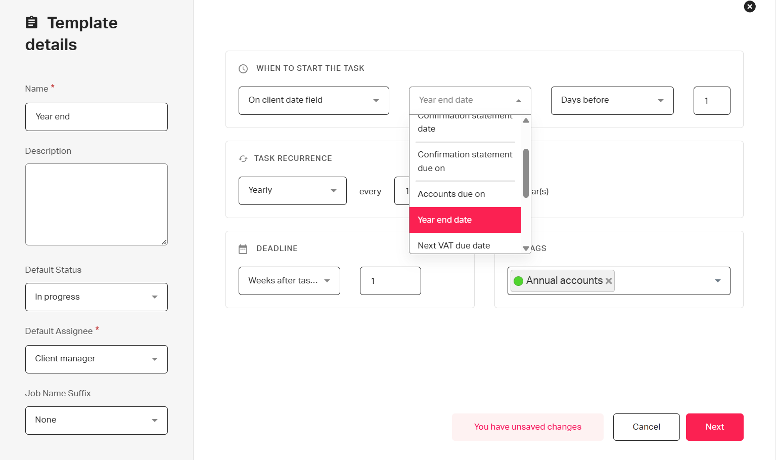 You can use these automatically populated details to theme task templates around and task dates, as shown below.